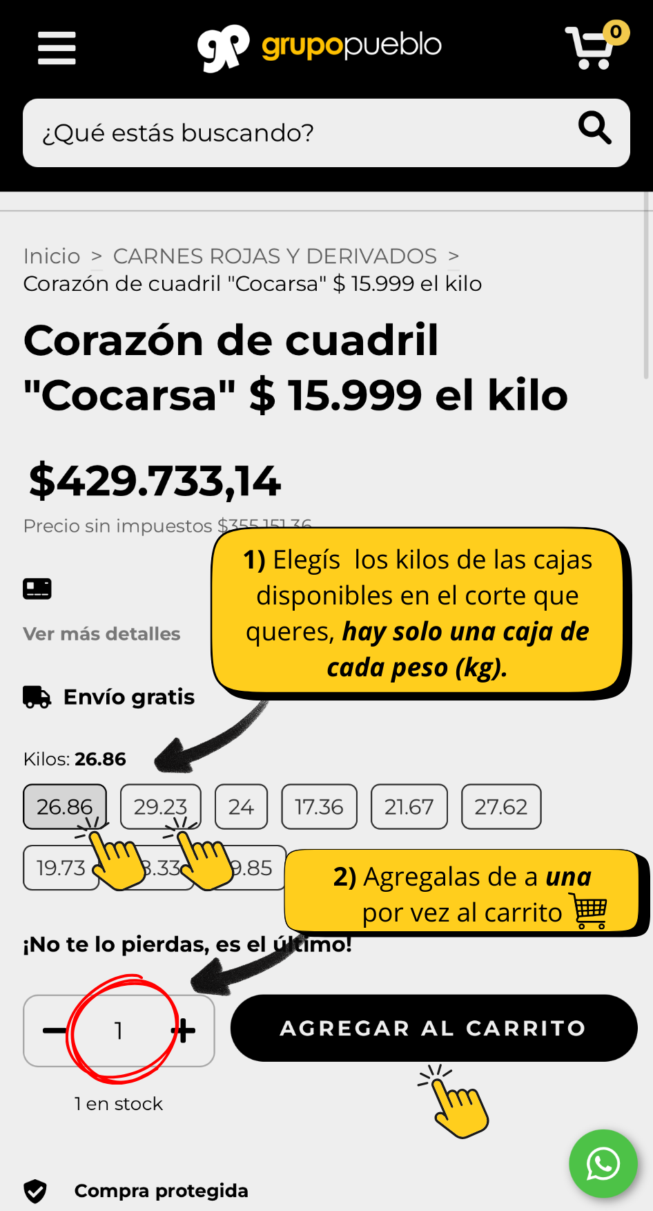 Selección: Agregá las cajas al carrito de a una por vez (cada caja tiene un peso único y hay solo una disponible de cada kilaje).